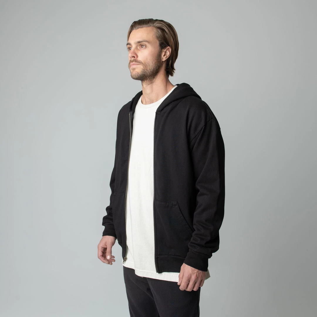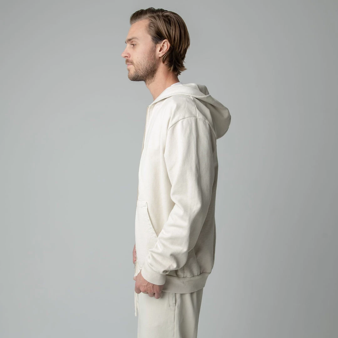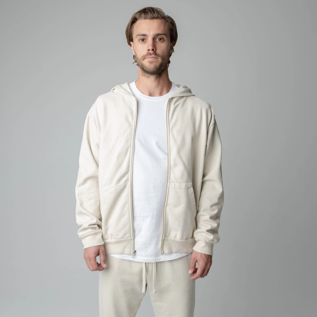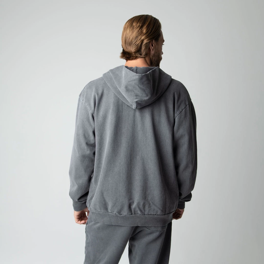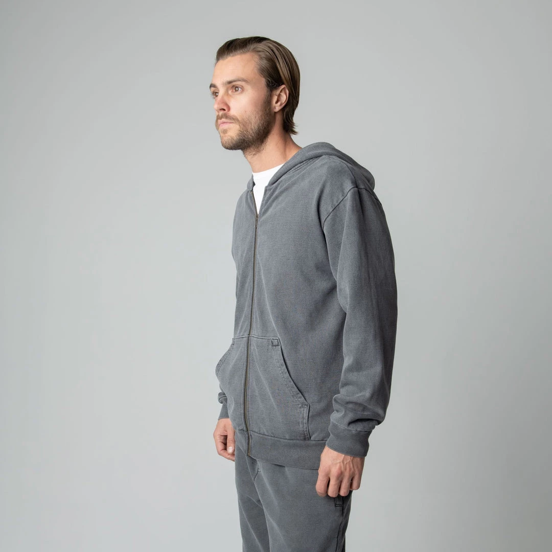 Built to mix, match, and layer. Our zip up is made from heavyweight, pigment-dyed heavyweight cotton fleece and is enhanced with a potassium finish for exceptional softness. Our zip up hoodie features an antique brass colored zipper, a double-lined hood and a kangaroo pocket. This piece is the essence of comfort and quality.