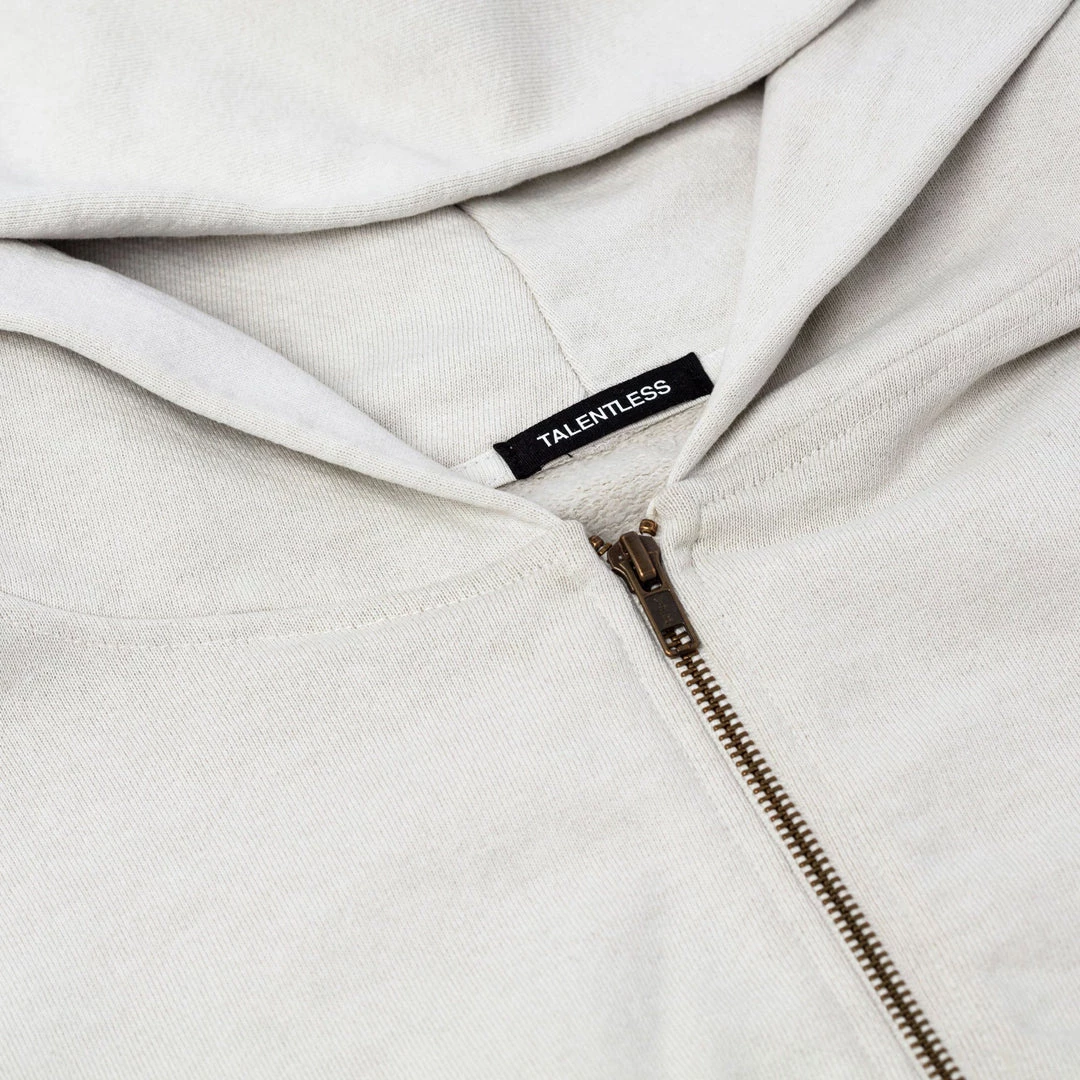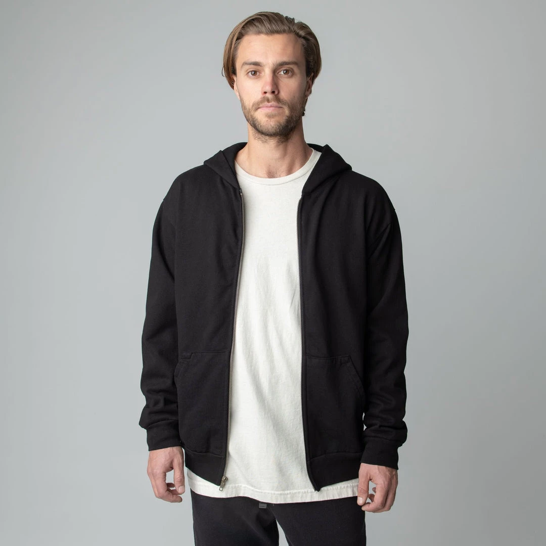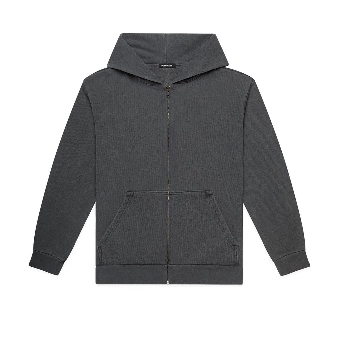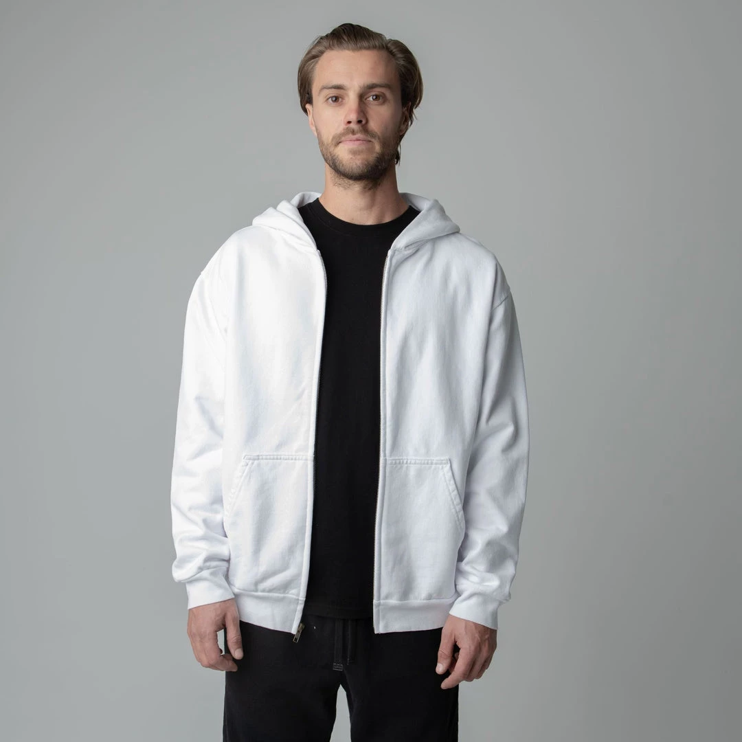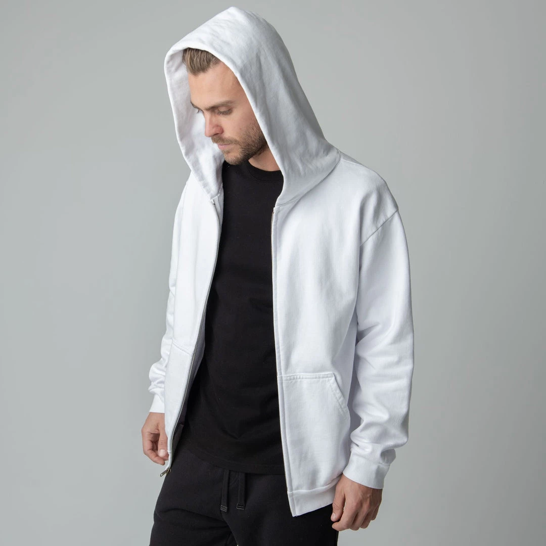 Built to mix, match, and layer. Our zip up is made from heavyweight, pigment-dyed heavyweight cotton fleece and is enhanced with a potassium finish for exceptional softness. Our zip up hoodie features an antique brass colored zipper, a double-lined hood and a kangaroo pocket. This piece is the essence of comfort and quality.