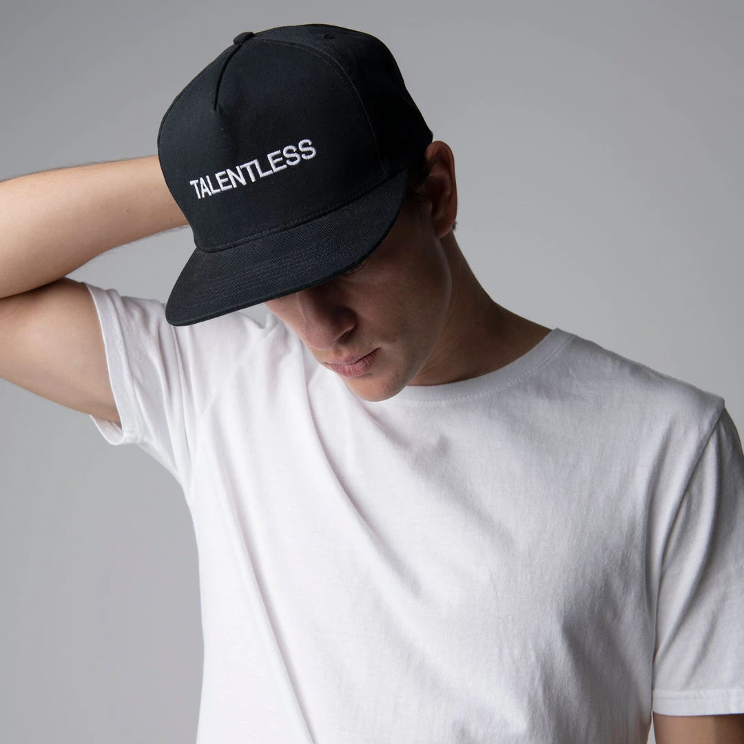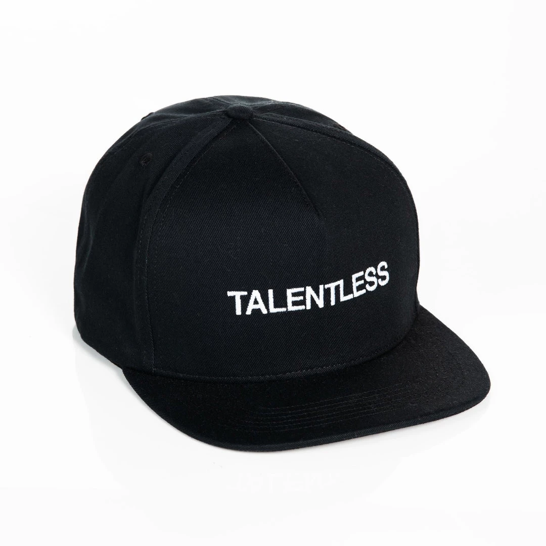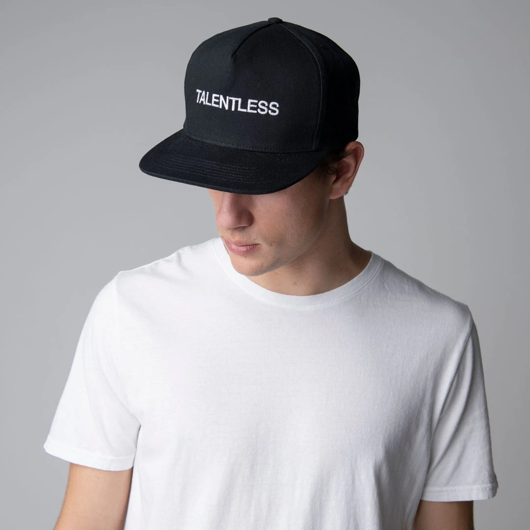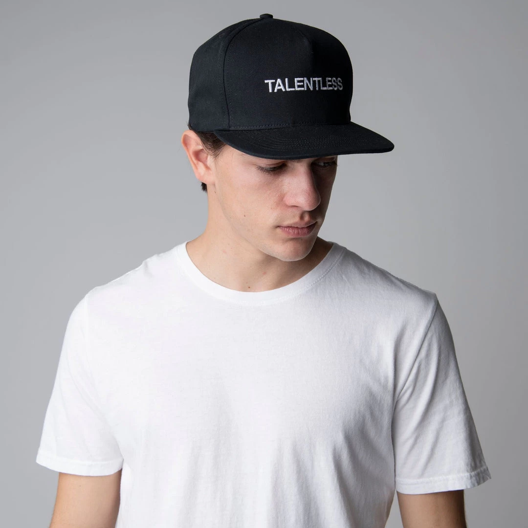 Breathable yet structured, the Core Logo Snap Back hat features a flat brim, cotton twill fabrication and adjustable strap in the back that snaps together. Its adjustable snap strap ensures a customized fit. Our classic white TALENTLESS logo is embroidered across the front.Â