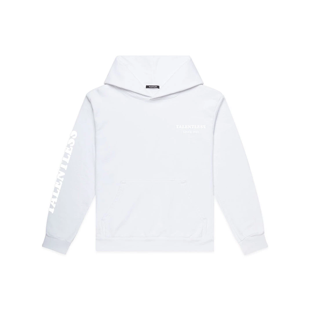 Our heavyweight, garment-dyed, 100% cotton hoodie with a touch of TALENTLESS branding in high density ink on the front and right sleeve.