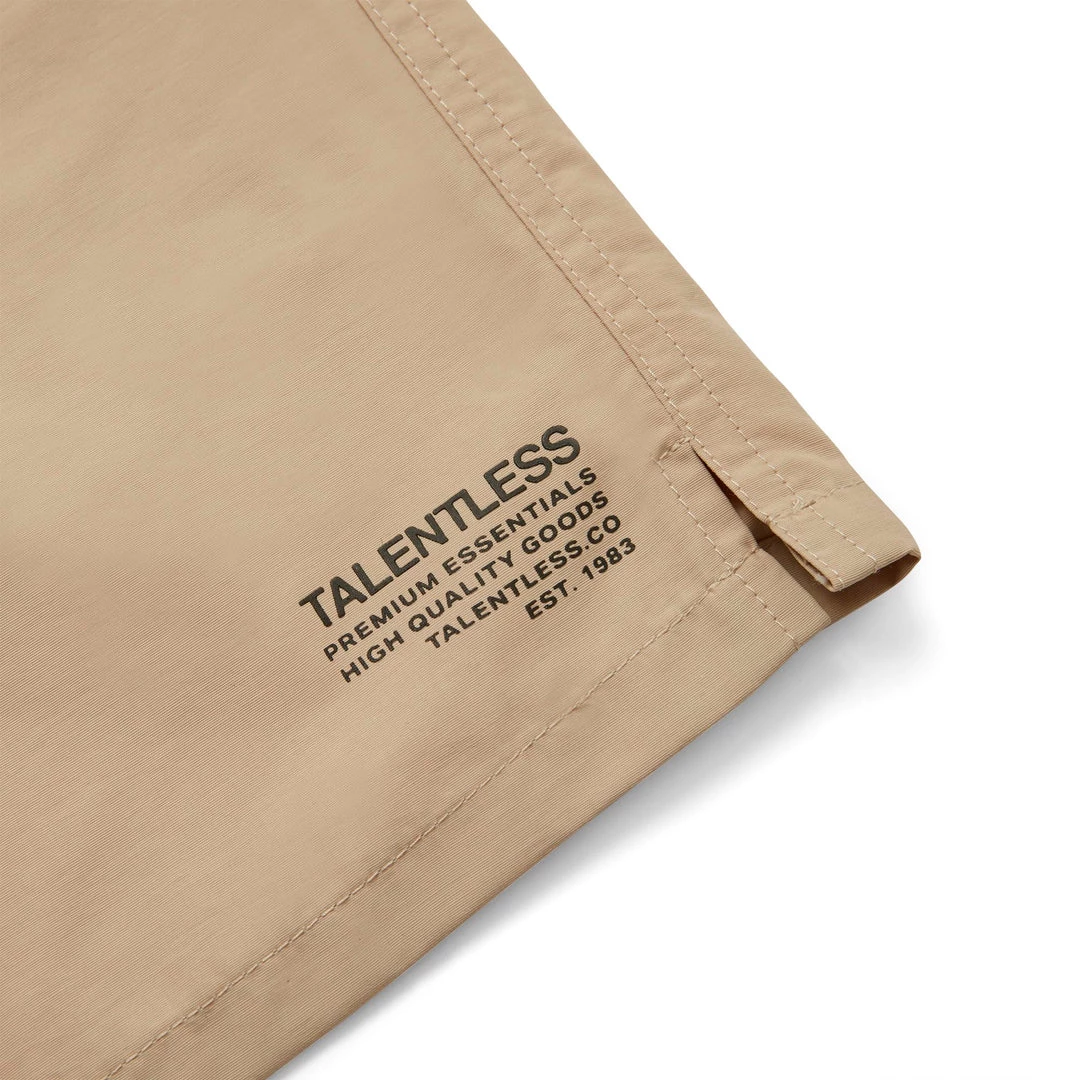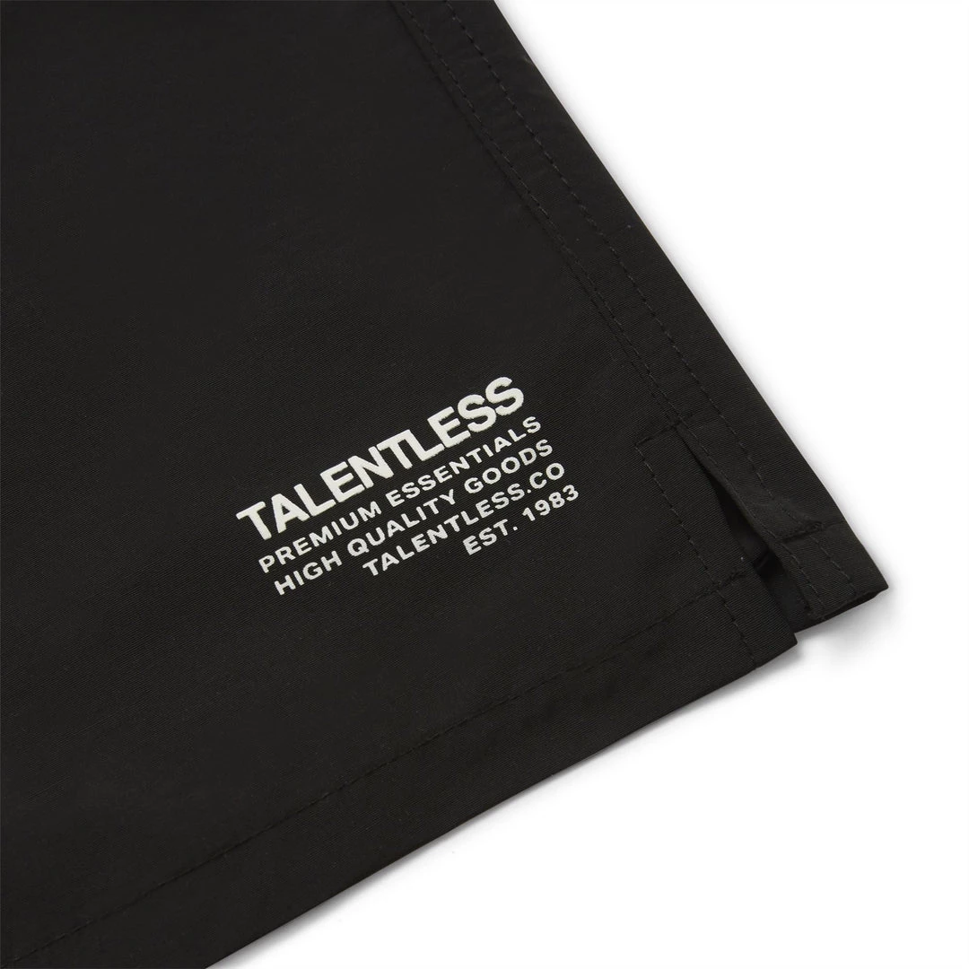 Side seam pockets with a double zip pocket on the right side, including a back welt pocket with zip closure. Â Talentless screen printed detail on the left leg.