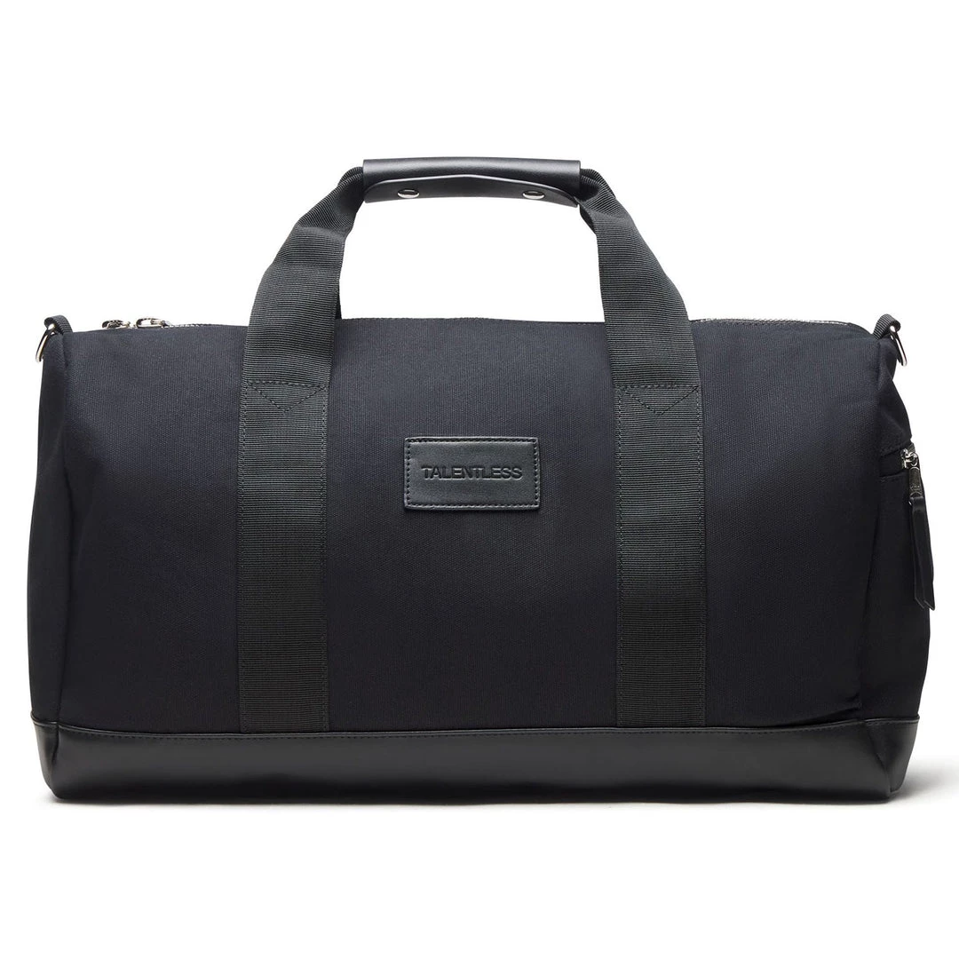 Introducing the new TALENTLESS Overnighter Duffle Bag. This is the perfect travel companion- whether you’re going away for the week or just for the night. The ultimate piece for the traveler on-the-go this versatile design features a sturdy shape, canvas body, adjustable nylon straps, and leather accents including our signature TALENTLESS logo. This black-on-black duffle bag is the perfect addition to your travel needs.
