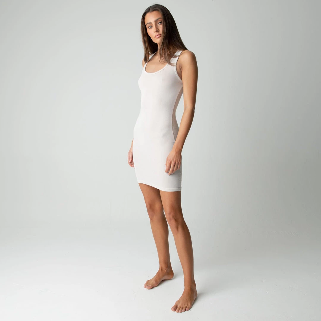 A formfitting piece, the Modal tank and Modal tank dress skim the body with touchable softness. Breathable modal fabric is made from natural beech tree pulp, resulting in a durable yet flexible textile. Slightly ribbed, these silhouettes add dimension with their subtle, tactile texture.Â